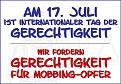 Ich habe einen Musterbrief hochgeladen, der diese Forderung so allgemein wie möglich und so konkret wie nötig an das Ministerium richtet. Lasst uns gemeinsam ein Gesetz gegen Mobbing fordern - und zwar ein Gesetz, dass jedem Mobbing-Opfer hilft! Der Musterbrief wird dieser Tage noch von einem Juristen quer gelesen, damit Formfehler vermieden werden, ist aber zur Information bereits verlinkt unter http://www.ilia-faye.de/pdf/Gerechtigkeit.pdf. Das Schreiben ist so angelegt, dass (entweder im Browser oder über Adobe Reader) nur Absender, Datum und Unterschrift ergänzt werden müssen - und ab die Post am 16. Juli...